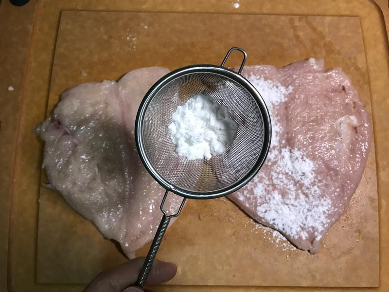 用小濾網上面放太白粉、撒滿兩面的雞胸肉. (沒有濾網的話、太白粉用沾的也可以) -
